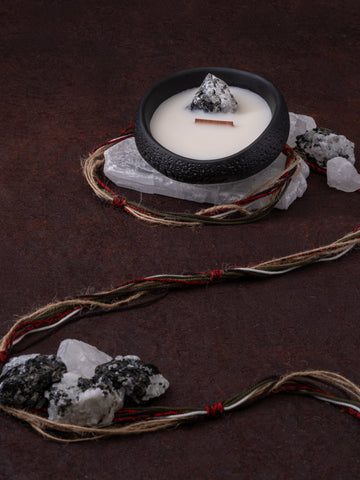Hand-poured with a natural blend of soy wax, palm wax (sustainably sourced), and beeswax, this candle is infused with Black & White Moonstone, the master healer that amplifies energy and restores clarity. Resting in a cement vessel and sealed with cinnabar ink paper, it is a ritual of purification and renewal.