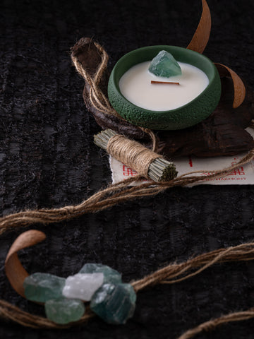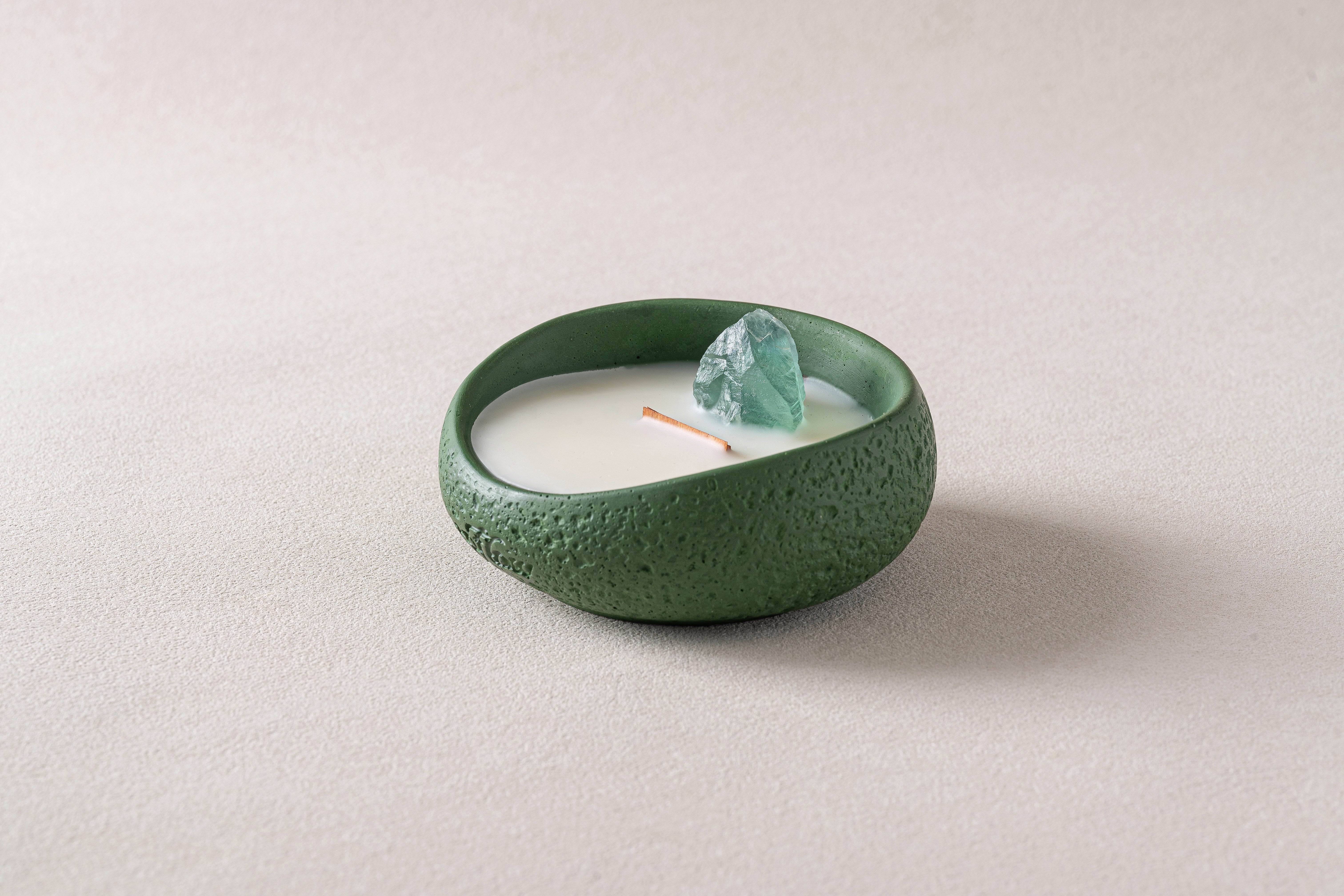 Hand-poured with a natural blend of soy wax, palm wax (sustainably sourced), and beeswax, this candle is infused with Green Fluorite, a crystal of clarity, emotional healing, and self-trust. Resting in a cement vessel, sealed with cinnabar ink print, it embodies the flow of love within and beyond.