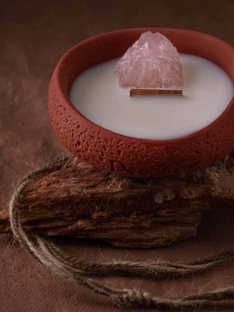 Hand-poured with a natural blend of soy wax, palm wax (sustainably sourced), and beeswax, this candle is infused with Strawberry Quartz, the crystal of romance, charm, and joyful connection. Resting in a handcrafted cement vessel and sealed with cinnabar-inked paper, it invites tenderness into every moment.
